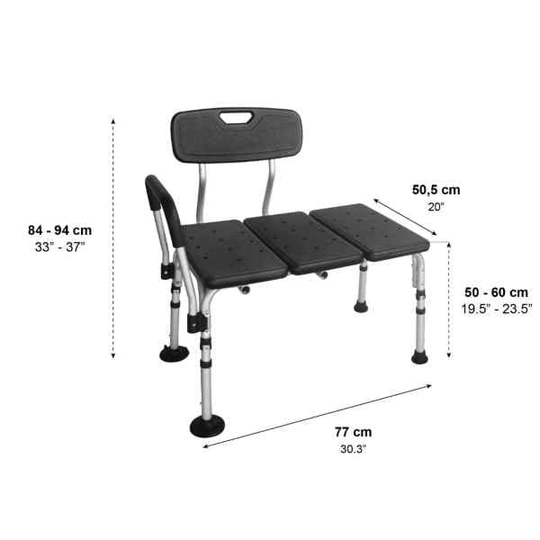 Denna badkarssits är höjdjusterbar i nio nivåer från 84 till 94 cm, med en anpassningsbar säteshöjd på 50–60 cm, vilket gör den kompatibel med badkar upp till 50 cm i höjd. Ryggstödet är reversibelt och kan enkelt anpassas för användarens komfort, medan de fasta handtagen ger extra stöd vid förflyttningar. Produkten är enkel att montera utan verktyg, vilket gör den både praktisk och användarvänlig.