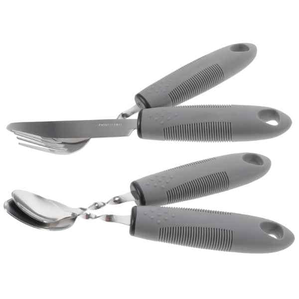 Varje bestick del har ett tjockt, halksäkert handtag i plast. Greppet följer handens naturliga rörelse, vilket skapar balans och stabilitet. Användaren kan därmed utföra rörelser med mindre ansträngning. Eftersom handtaget är tjockare än standard, ligger det bekvämt i handen och ger ett fast grepp.