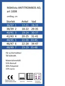 Förbandsstrumpa natur storlek 42-43 är en knälång kompressionsstrumpa utan tå med graderat tryck som ger jämn och skonsam kompression i vardagen. Konstruktionen i elastisk bomullsblandning är följsam och stabil, därför sitter strumpan tryggt under hela dagen. Kompressionsklass 1 med tryck vid ankeln 16 till 21 mmHg enligt SS872400 skapar ett kontrollerat tryckförlopp från ankel upp mot knä. Förpackningen innehåller en glidsocka som gör påtagningen snabb och skonsam. Den vita modellen har en blå storleksring vid tån som tydligt markerar storlek och underlättar sortering.