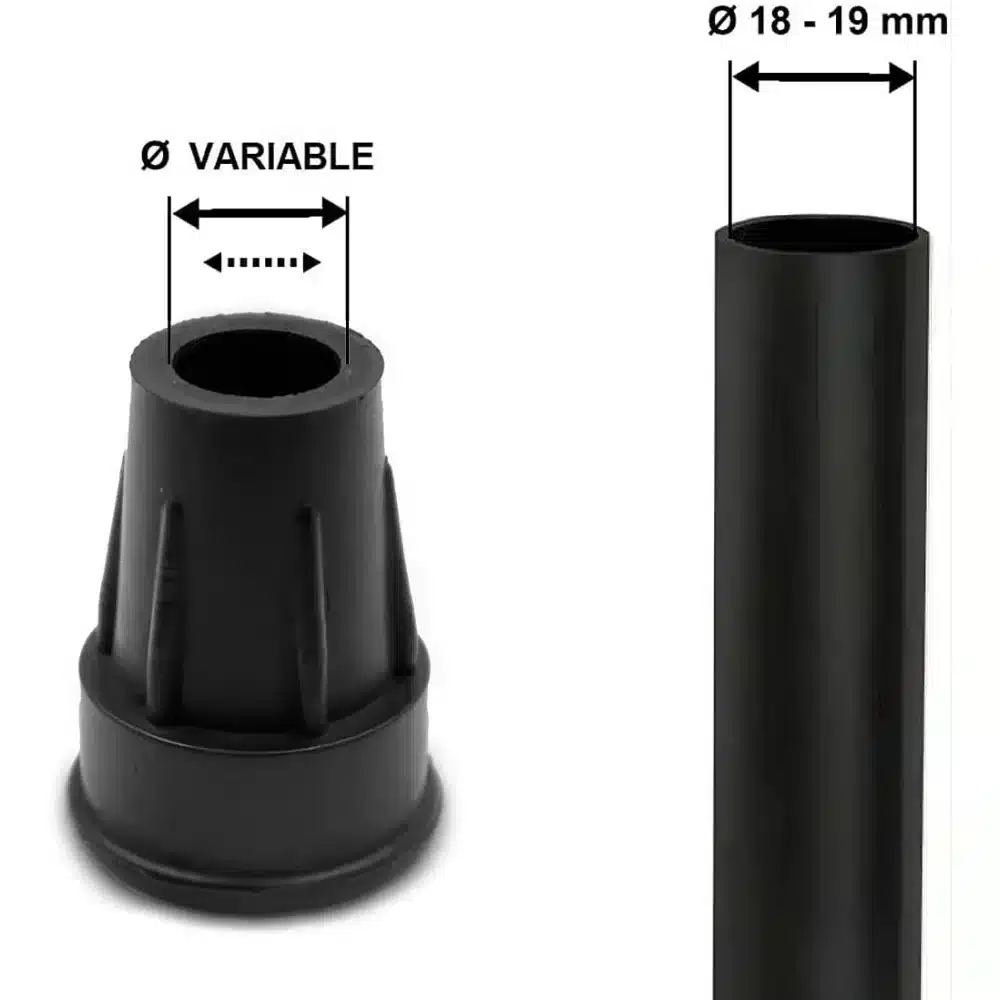 Kryckdoppar halkskydd gummi 17–19 mm monteras på nederdelen av kryckor eller käppar för att ersätta slitna eller skadade doppar. Den flexibla gummikonstruktionen ger en viss stötdämpning vid belastning och bidrar till en stabil gångrörelse.