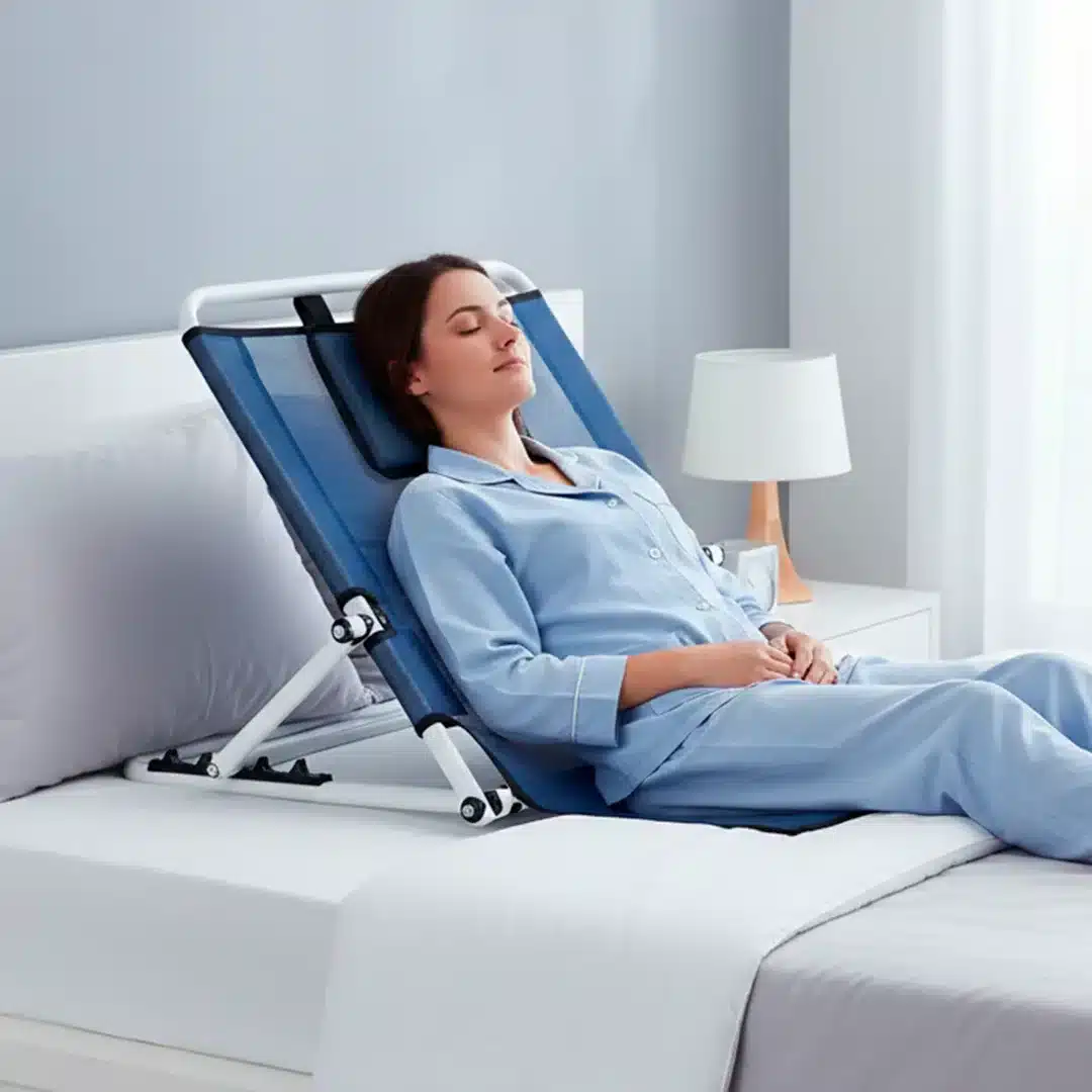 Mobilt ryggstöd för säng är ett hopfällbart och justerbart ryggstöd i stål och polyester med fem lutningslägen och låg vikt för enkel hantering.