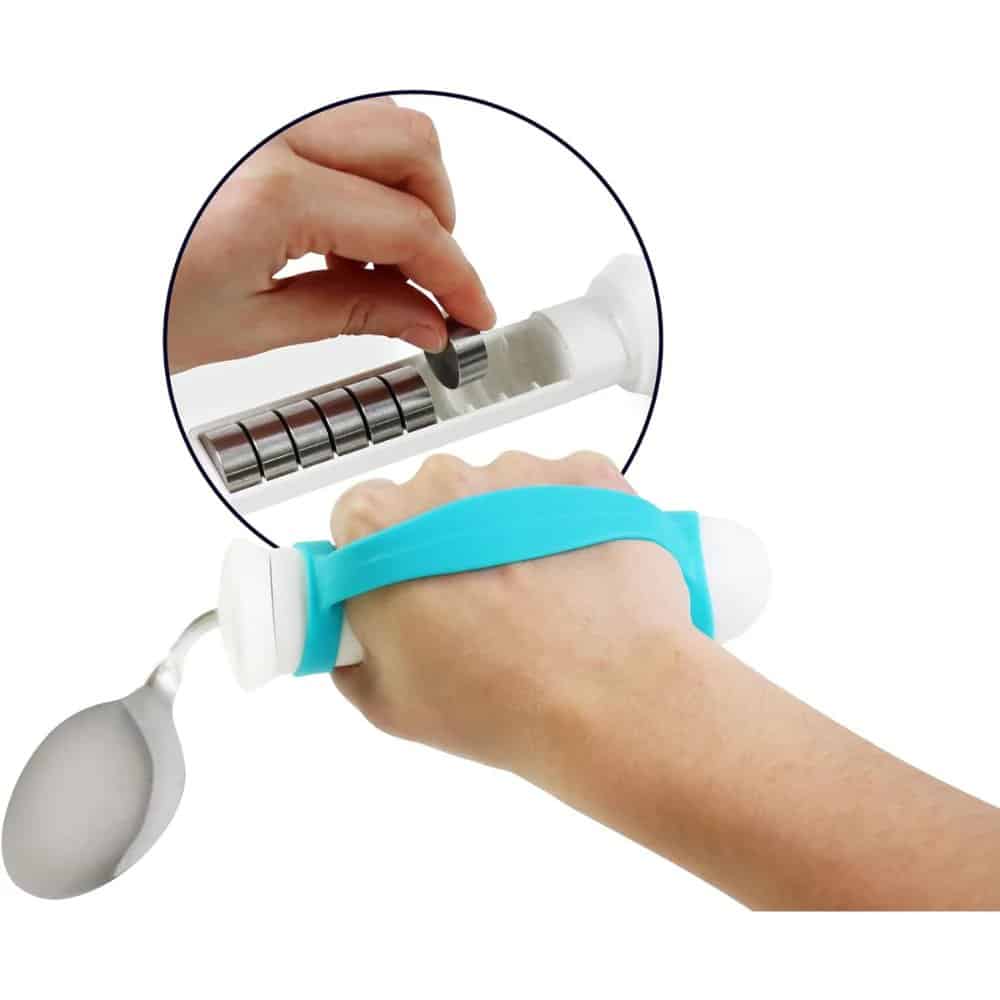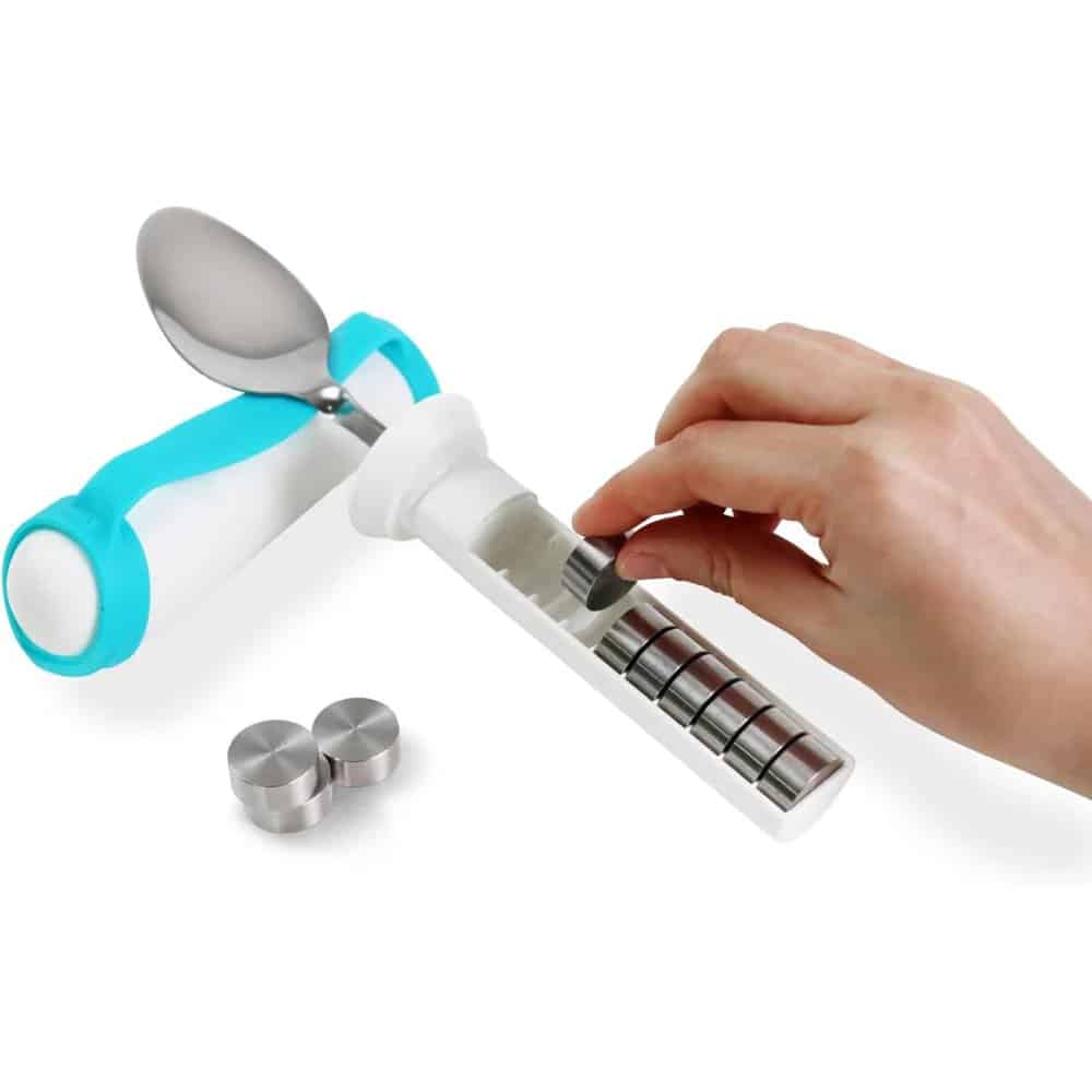 Handtaget är utrustat med ett system för löstagbara vikter. Totalt medföljer 10 vikter som enkelt kan sättas i eller tas bort för att justera skedens tyngd och balans.