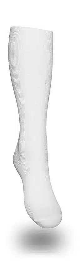 Den vita modellen har en luftig och hudvänlig design som gör den särskilt lämplig för daglig användning året runt. Materialet andas väl och håller fötterna torra, medan den förstärkta hälen ger extra slitstyrka. Stödstrumpa är CE-märkt, registrerad hos Läkemedelsverket och tillverkad av ÖKO-tex-certifierade material som garanterar hög kvalitet och säkerhet.