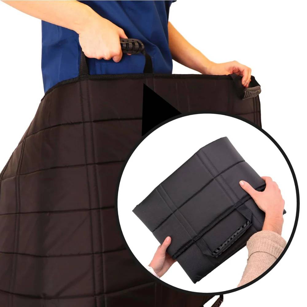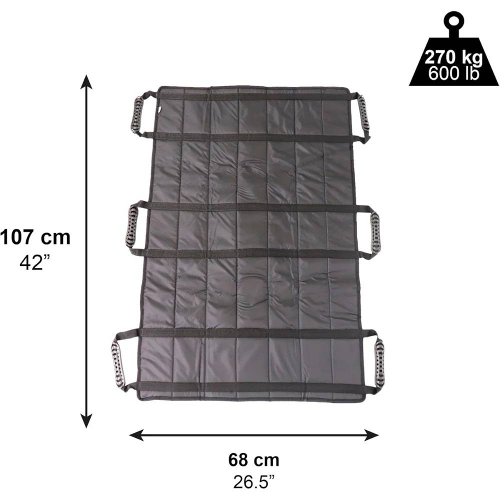 Detta transfereringslakan med 6 handtag kräver inga verktyg eller fasta installationer. Det kan snabbt tas fram vid behov och därefter vikas undan, vilket gör det till en praktisk lösning för både sjukhusmiljöer och vård i hemmet.