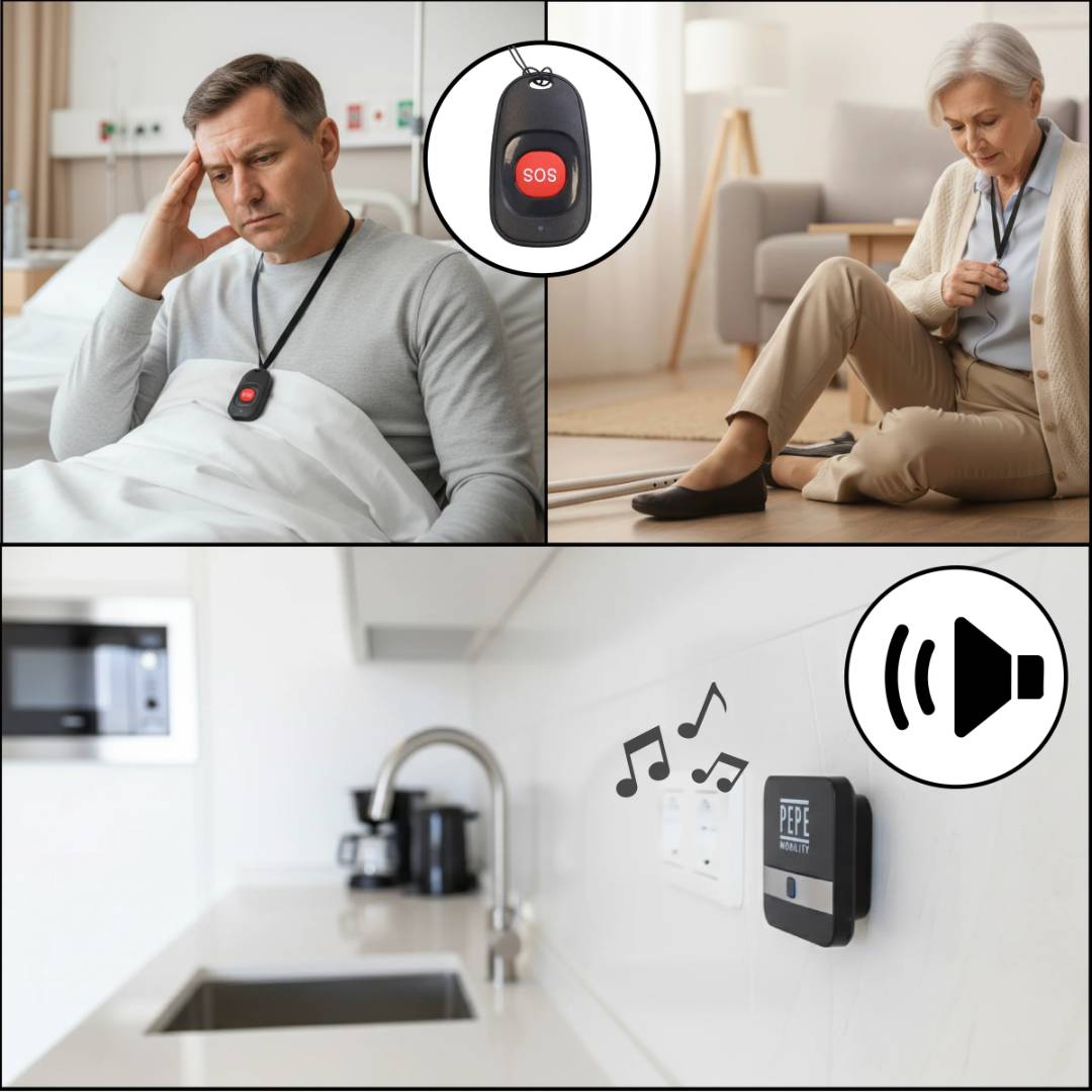 Trygghetslarm system med SOS-knapp och larmenhet, 52 melodier och upp till 200 m räckvidd för signalering i hemmet