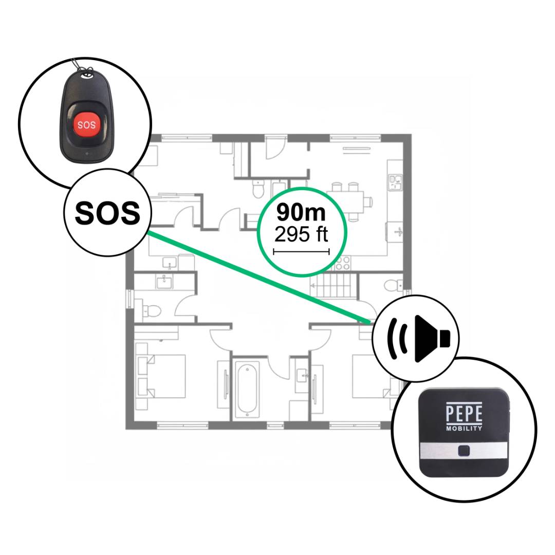 Vid behov trycks SOS-knappen in vilket aktiverar ljudsignal och ljusindikering på mottagarenheten. Ljudet spelas upp enligt vald melodi och stoppas när melodin avslutas. För att upprepa signalen trycks knappen in igen. Systemet fungerar inom angiven räckvidd mellan enheterna.
