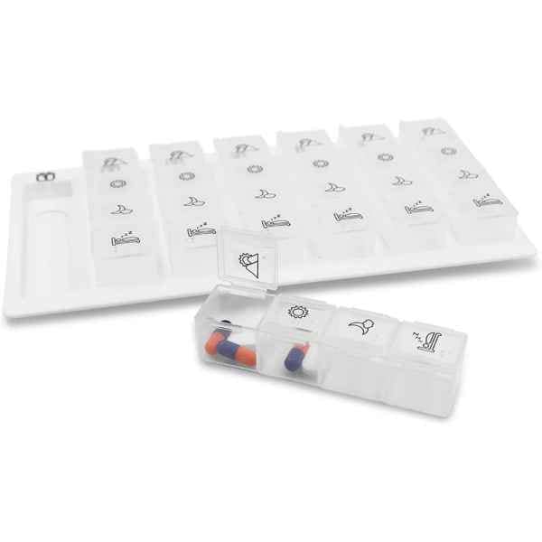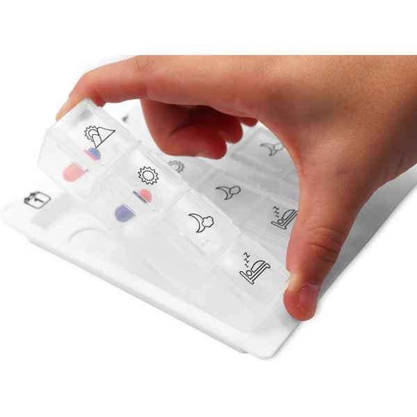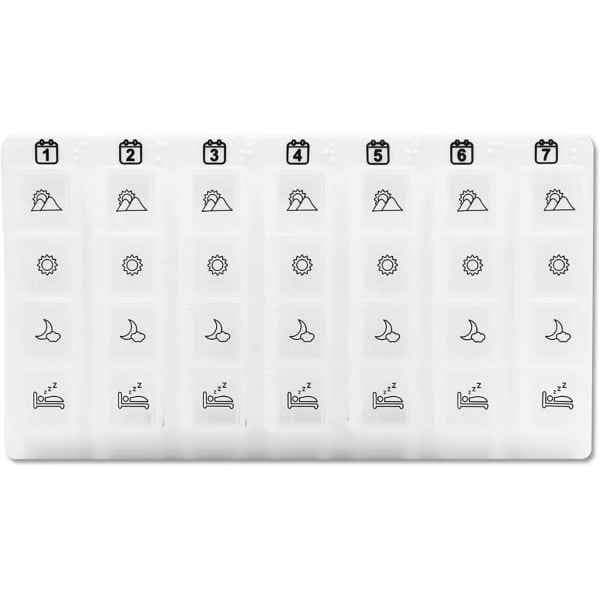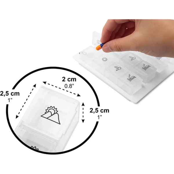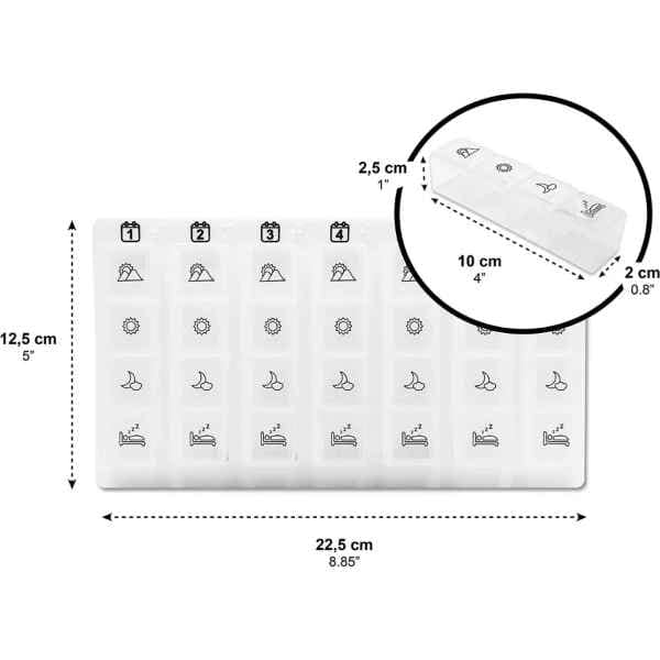 Veckopillerdosetten med fyra fack per dag är en praktisk lösning för att organisera och säkerställa medicinering under hela veckan. Varje dag är indelad i fyra separata fack (morgon, middag, kväll och natt) för att hålla reda på olika doser och undvika glömda mediciner. Den är tillverkad av säker och hållbar PP-plast och är utrustad med genomskinliga lock som gör det enkelt att kontrollera innehållet. Dosetten har ett säkert låssystem som förhindrar att facken öppnas under transport, vilket gör den idealisk att ta med på resor eller till arbetet. Varje fack är lätt att öppna och stänga, och de dagliga doserna kan enkelt tas ut för smidig hantering.